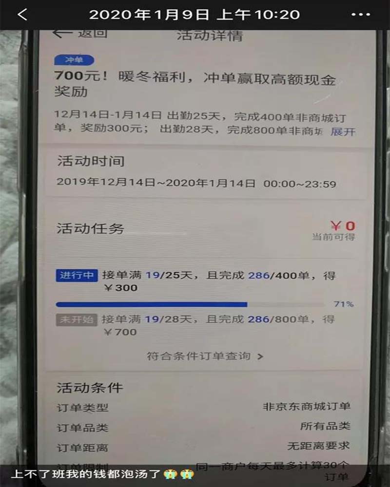 因为有母亲时不时的帮忙,飞飞才得以抽空工作。她选择在北京当一名达达快递员。一方面工资可以支持生活,另一方面可以自由选择接单时间,方便照顾果宝。