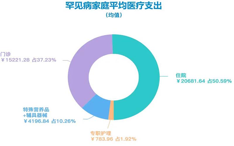 虽然这是个极端个案,但总体而言,对于罕见病家庭来说家庭医疗的价格很高。总体上罕见病家庭的家庭医疗费用高达4万元,约占据罕见病家庭平均收入的50%(取中位数),其中50%以上来自住院费用,其次是门诊费用。特殊营养品、辅器用具费用与家庭专职护理费用的占比较少。