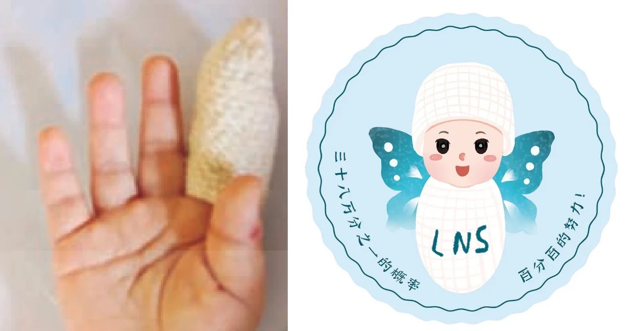 LNS 患儿手指缠绕的纱布团(左);蚕宝儿徽章(右)