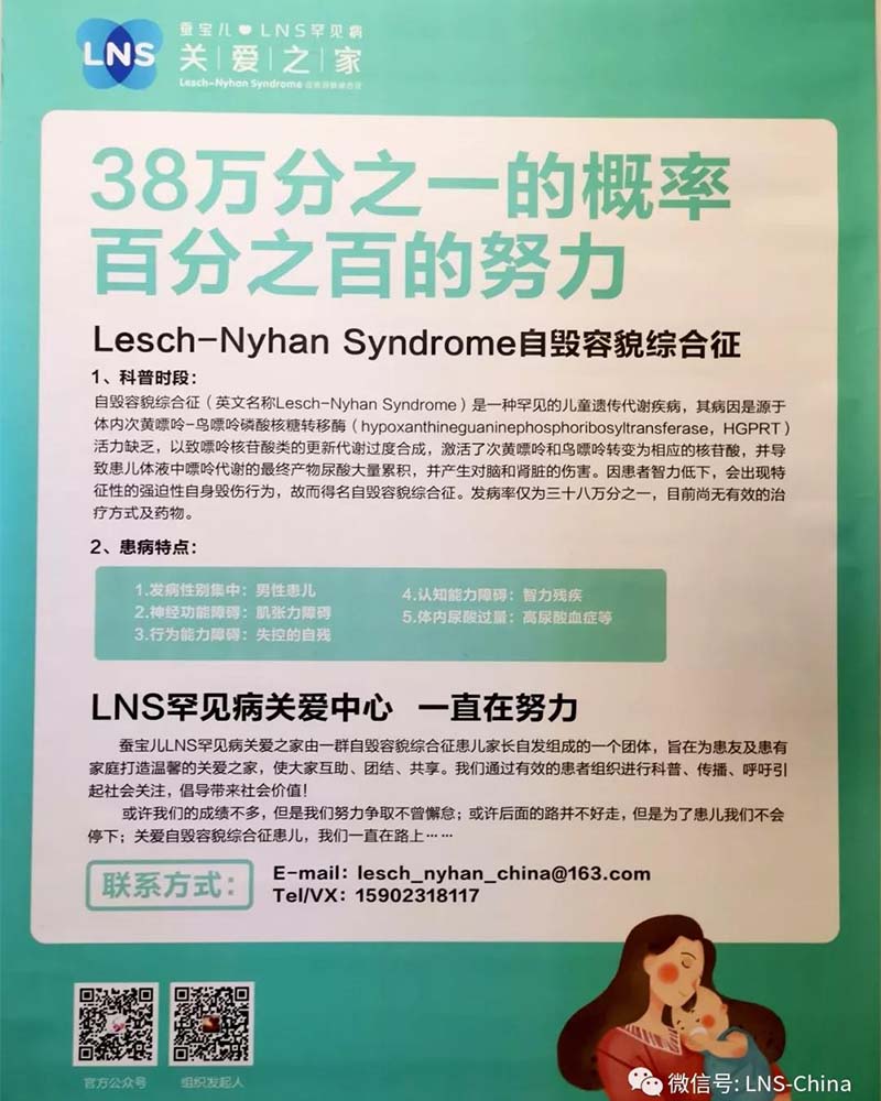 从决定参加本次论坛以来,我们就希望可以在此次论坛上宣传LNS,让更多的专家、医生、药企、媒体认识“罕见病中的罕见病”——LNS!而后,我们的“38万分之一的概率,百分之一百的努力”海报出炉,非常荣幸,我们审核通过了主办方(Cord)对本次大会的壁报征集方案!我们LNS患者群体将出现在公众面前,是一次很好的亮相机会!