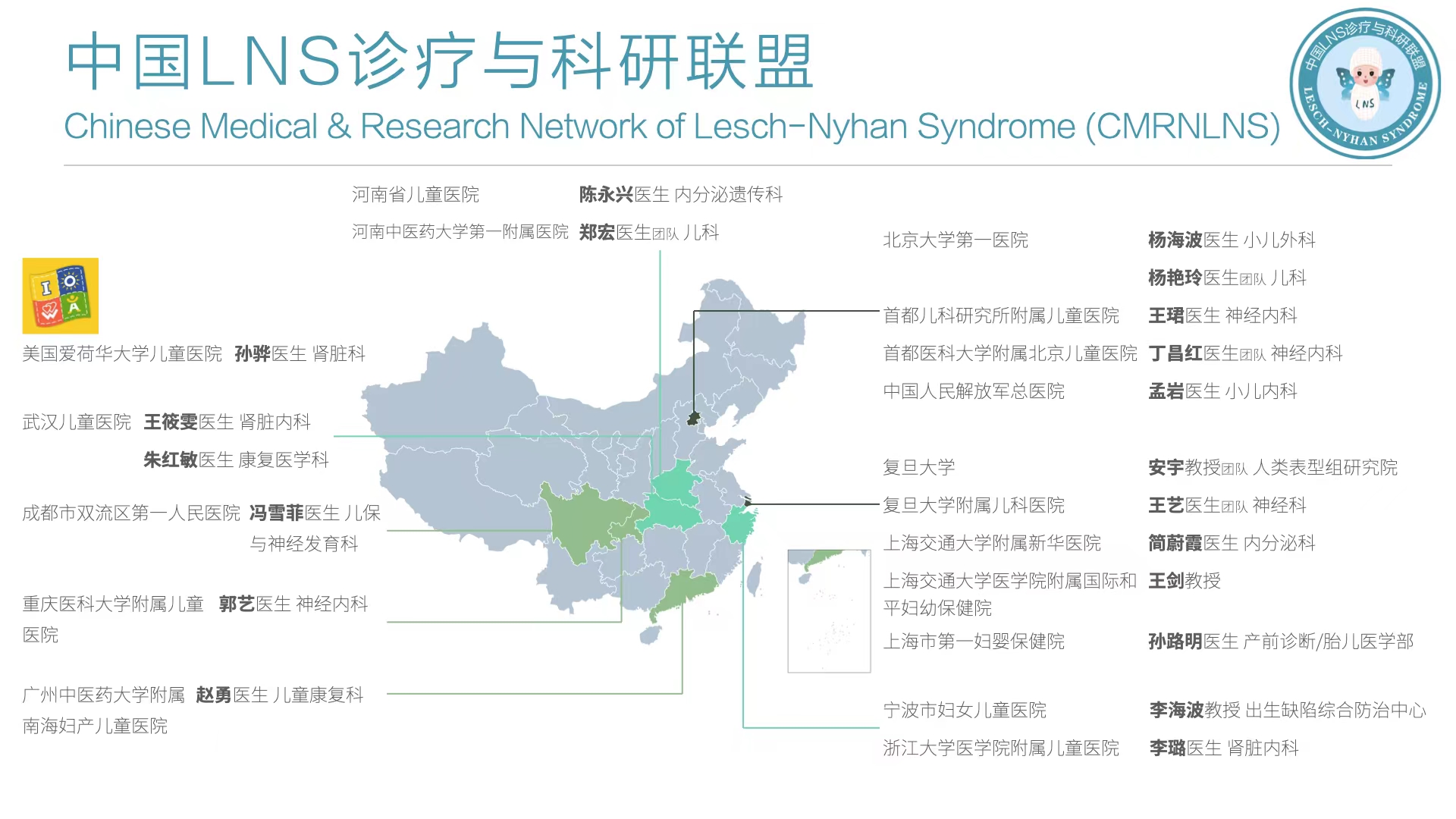中国LNS诊疗与科研联盟(Chinese Medical and Research Network of Lesch-Nyhan Syndrome,CMNLNS)(原:中国LNS诊疗联盟)成立于2019年4 月,由遗传学与罕见病科普公益平台“豌豆Sir”创始人陈懿玮博士与重庆市九龙坡区蚕宝儿社会工作服务中心理事长黄倩女士联合发起。联盟由对LNS有诊疗经验的专家组成,来自跟LNS相关多学科,包括儿科、遗传代谢科、儿童神内科、儿童肾脏科、康复科以及遗传学科。2023年1月,“中国LNS诊疗联盟”扩展“为中国LNS诊疗与科研联盟”。目前由19位专家组成。