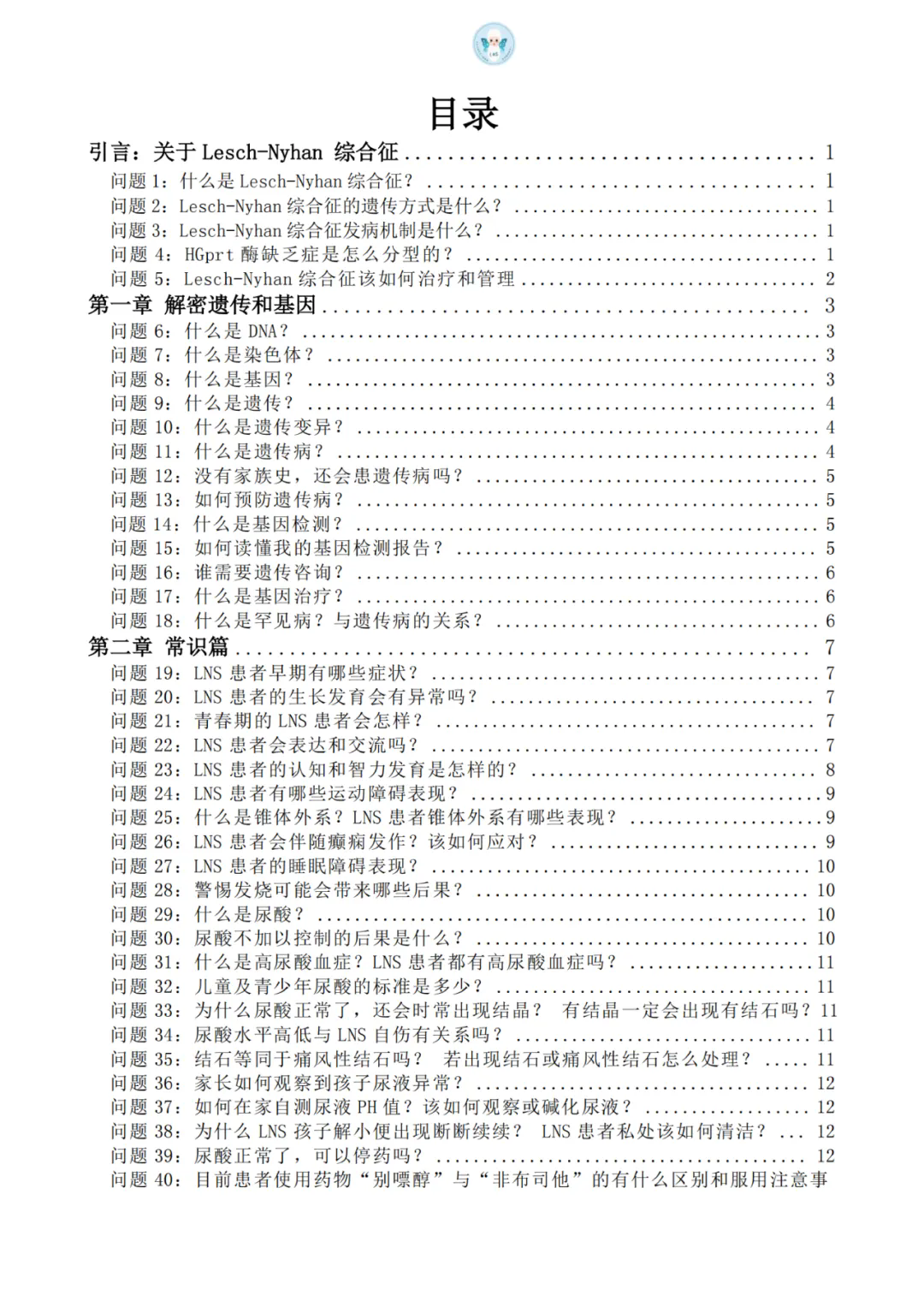 《Lesch-Nyhan综合征100问》以下简称《LNS100问》,是一本献给中国LNS患者家庭的疾病实用照护手册。该手册以便于阅读的问答方式呈现,一共整理了100个问题,包含以下LNS相关内容:罕见病科普、疾病基础知识、患者全方位照护经验、患者生存状态改善方法、就医用药信息参考、护具辅具汇总资料、家庭亲子关系建议、政策福利分享等。