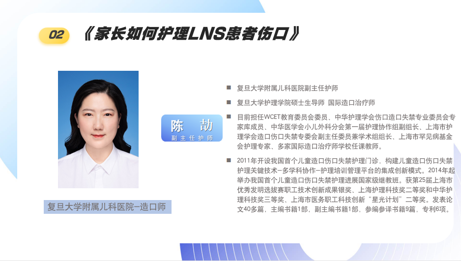 以下是第二期内容:复旦大学附属儿科医院-造口副主任护师陈劼老师,为全体LNS患者家庭带来《家长如何护理LNS患者伤口》的专题讲座。