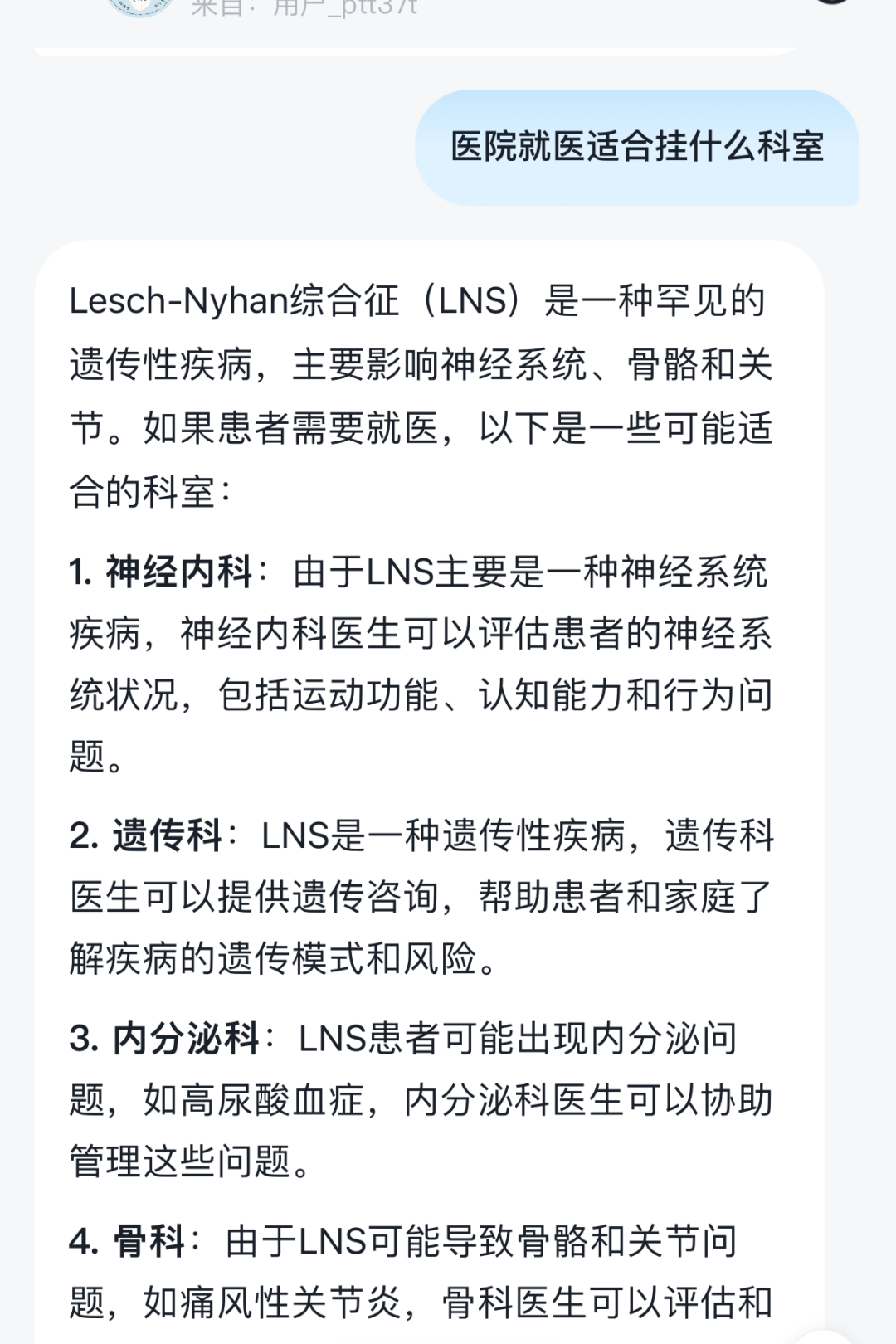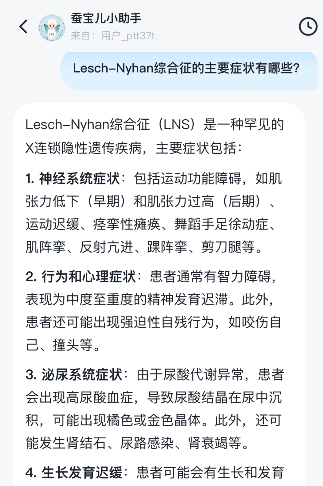 在这个信息化时代,快速便捷获取相对准确的信息变得越来越重要。今天,我们非常隆重推出一款全新的智能化信息检索服务工具《LNS.AI.小助手》,一款专为解析Lesch-Nyhan综合征(LNS)而设计的智能平台。