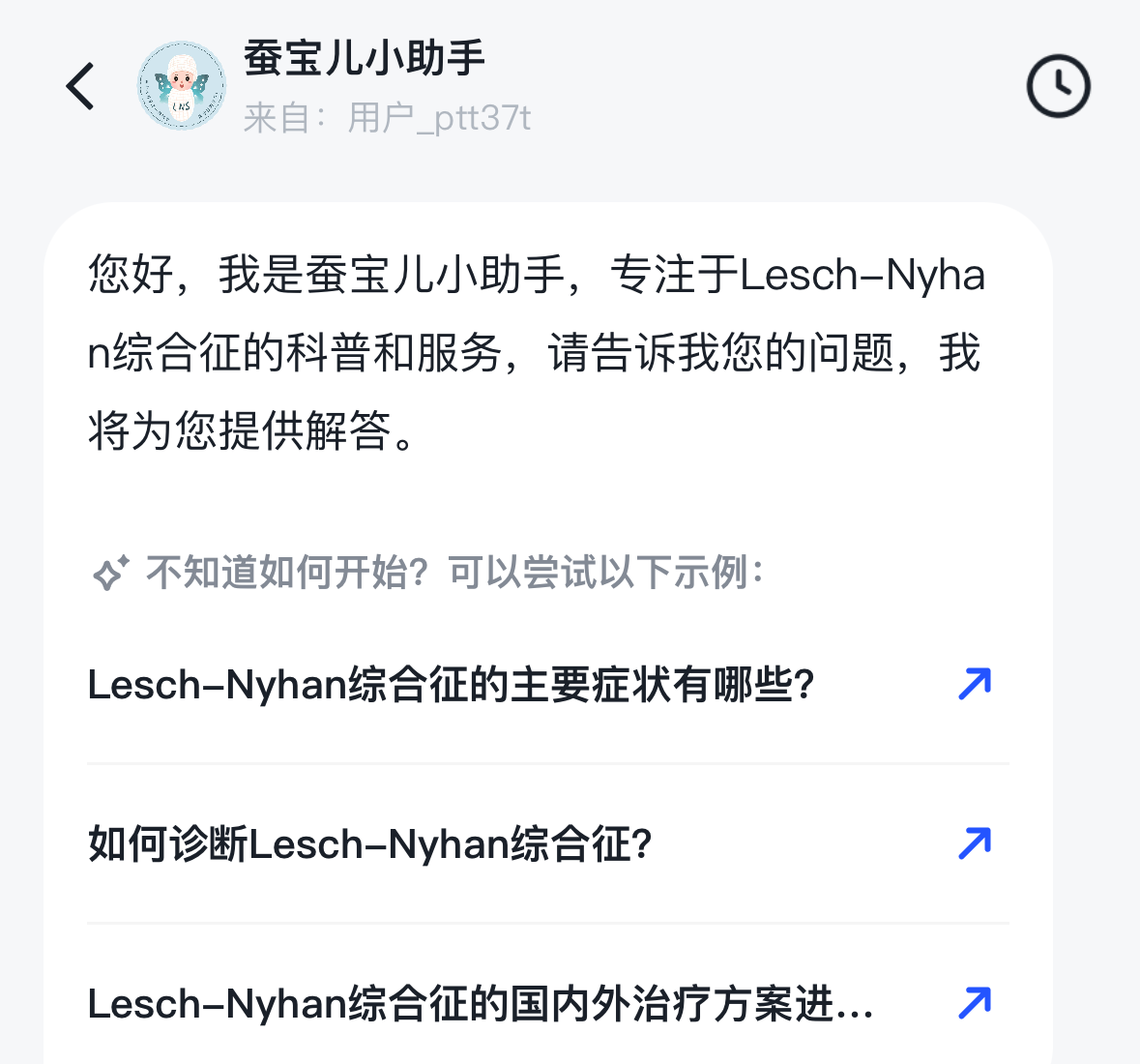 通过扫描二维码,到访者可快速访问《LNS.AI.小助手》,用户只需输入跟疾病相关的任一问题关键词,系统即可在秒级内反馈HPRT1基因突变信息、临床症状、治疗方案及最新研究进展,为到访者提供全面的参考极大提高了信息获取效率。