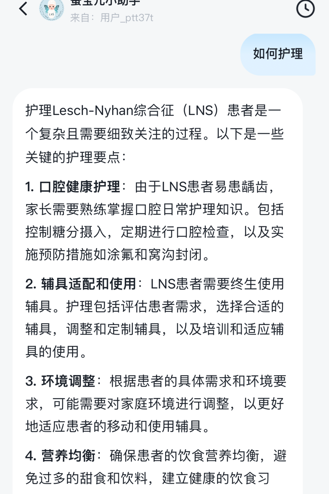 《LNS.AI.小助手》工具不仅包含文献知识,还根据国内外护理经验的信息资料进行录入,所以,可深度检索Lesch-Nyhan综合征的病因、症状、诊断和治疗方法以及和如何护理患者等并获得疾病相关的全方面知识的深度解析。