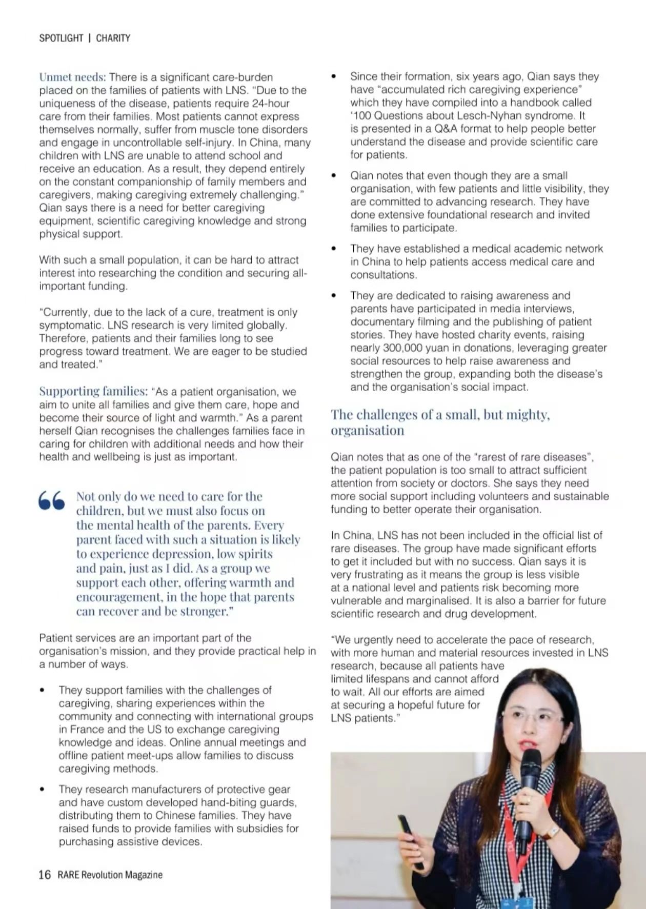 《RARE REVOLUTION Magazine》是一份国际非营利性且为世界领先和屡获殊荣的罕见病出版刊物,旨在致力于提升人们对罕见病的认识,并提供高质量的罕见病教育和为罕见疾病患者,护理人员和慈善机构的发声;据统计,截止2023年,该杂志在线内容和社交媒体每年在全球拥有超过5000万的观众;《RARE REVOLUTION Magazine》所在的NRG集体还包含TIDE患者参与和罕见青年革命之家,立志为扭转罕见病的趋势尽自己的一份力量。